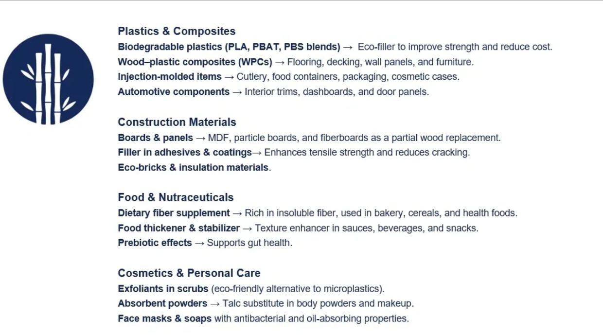 Milled bamboo powder (also called bamboo fiber powder or bamboo flour) is a versatile bio-based material with a wide range of applications across industries. Here’s a comprehensive list of its uses: